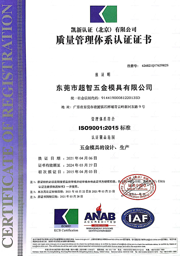 東莞市超智五金模具有限公司(Dong guan Wisdom Tool & Die Co.,ltd.)成立于2013年,公司面積4200平方米,員工120人,公司專注于設計和制造五金模具,產(chǎn)品主要應用于汽車、部分應用于電子和家電。模具主要種類包括:連續(xù)模,機械手,工程模等,模具范圍從80-1200噸不等。產(chǎn)品終端客戶主要有奔馳,寶馬,雷諾,雪鐵龍,標志,通用,福特,豐田,本田,惠普,IBM比亞迪等等。模具主要銷往美國,加拿大,墨西哥,德國,西班牙,法國等。